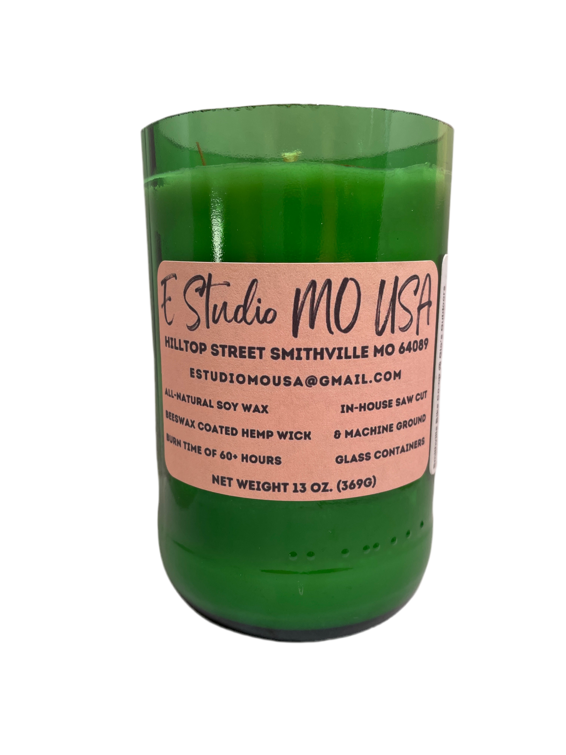 Phthalate free fragrance oil, 13oz, 60+ hour burn time, 3" diameter, single beeswax coated organic hemp wick, small-batch handcrafted soy candle by E Studio MO USA