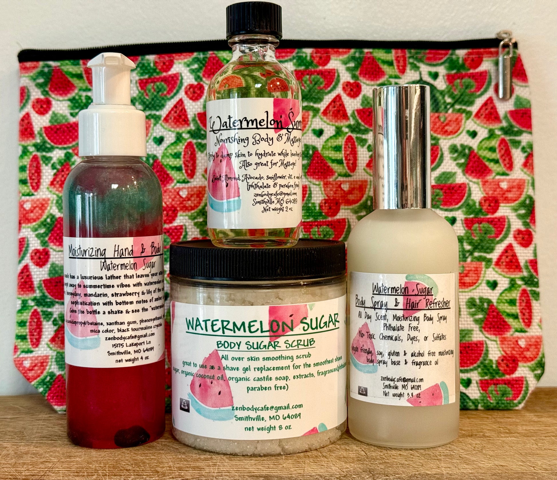 Get swept away to a time of watermelon lip smackers or even blowing big bubbles with sweet watermelon gum. This gift set is definitely a taste of summer! With notes of watermelon, honeydew, mandarin, strawberry and lily of the valley. Bottom notes of amber and violet add some depth & sophistication. All handmade in small batches. Products are free from Phthalates, Parabens, Dyes and other Harsh Chemicals.